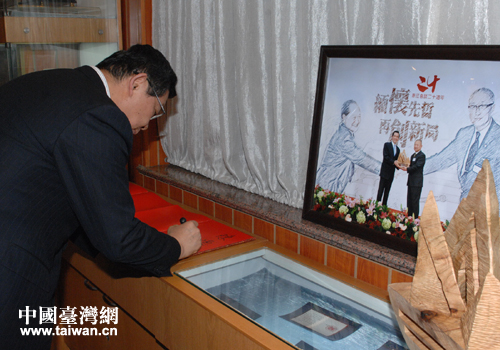 陳德銘及一行在汪道涵坐像前整齊肅立,三鞠躬并敬獻(xiàn)鮮花。陳德銘高度評(píng)價(jià)汪老高尚品格以及為促進(jìn)祖國(guó)和平統(tǒng)一大業(yè)所作的重大貢獻(xiàn)。陳德銘表示今年是“汪辜會(huì)談”20周年,海協(xié)會(huì)要學(xué)習(xí)和繼承汪老的精神,矢志不移地致力于推動(dòng)兩岸關(guān)系和平發(fā)展。