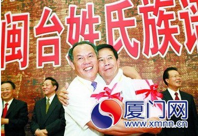 交換族譜后,來(lái)自海滄的謝福坤與來(lái)自臺(tái)灣桃園縣的謝和宗緊緊相擁。(來(lái)源:廈門(mén)日?qǐng)?bào))