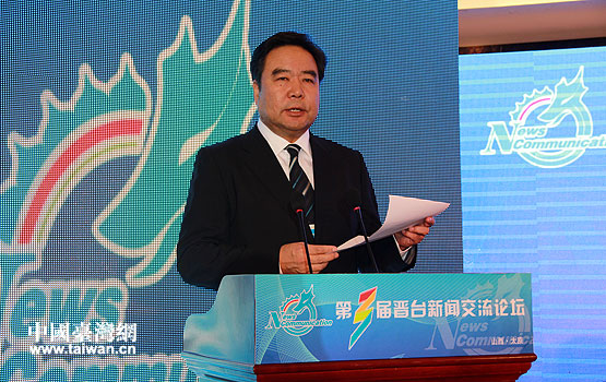 中共山西省委宣傳部副部長、省委外宣辦主任、省新聞工作者協(xié)會常務(wù)副主席郭健宣讀《第三屆晉臺新聞交流論壇四點共識》。(中國臺灣網(wǎng) 李丹 攝)