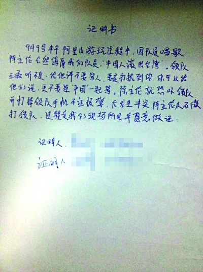 為了確證自己所言無誤,王磊向北青報記者提供了一份由團(tuán)里兩名游客書寫的證明書,并準(zhǔn)備作為以后打官司的證據(jù)。該文肯定了因唱歌遭到臺北男子辱罵后,王磊前去和解,但遭繼續(xù)挑釁并被打掉手機(jī)而發(fā)生沖突的事實(shí),“過程是我們現(xiàn)場所見并愿意作證”。王磊向北青報記者提出保護(hù)證明人信息的申請,北青報記者隱去了兩位游客的姓名及電話。