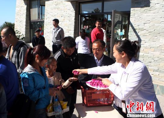 2日上午,威海劉公島國家森林公園主任王建松在臺贈大陸動物族譜上填上“天天”的名字。工作人員還準備了雞蛋、花生等禮品,分發(fā)給現(xiàn)場游客,慶祝小鹿?jié)M月。