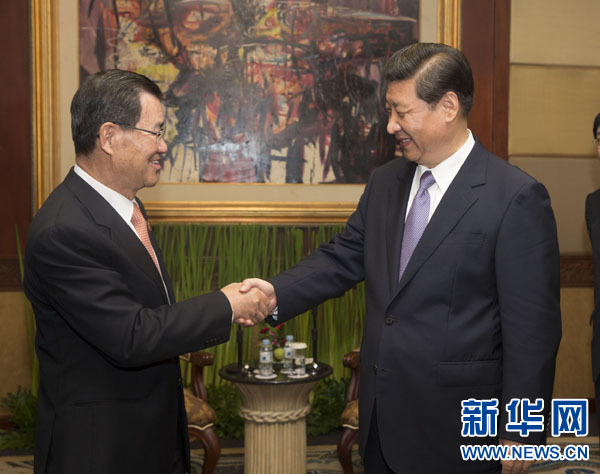 10月6日,中共中央總書記習(xí)近平在印度尼西亞巴厘島會見臺灣兩岸共同市場基金會榮譽(yù)董事長蕭萬長一行。 新華社記者蘭紅光攝