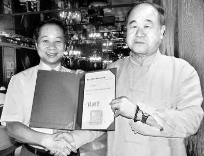 據(jù)臺灣媒體報道,臺師大校長張國恩4日上午帶領(lǐng)該校文學(xué)院院長、國際與僑教學(xué)院院長、國文系主任以及應(yīng)用華語文學(xué)教授等人,在臺北與媒體茶敘時宣布,已成功延攬并禮聘到大陸諾獎得主莫言擔(dān)任該校講座教授,同時還拿出莫言接受聘書時與張國恩的合影(見圖)。