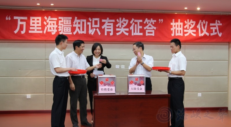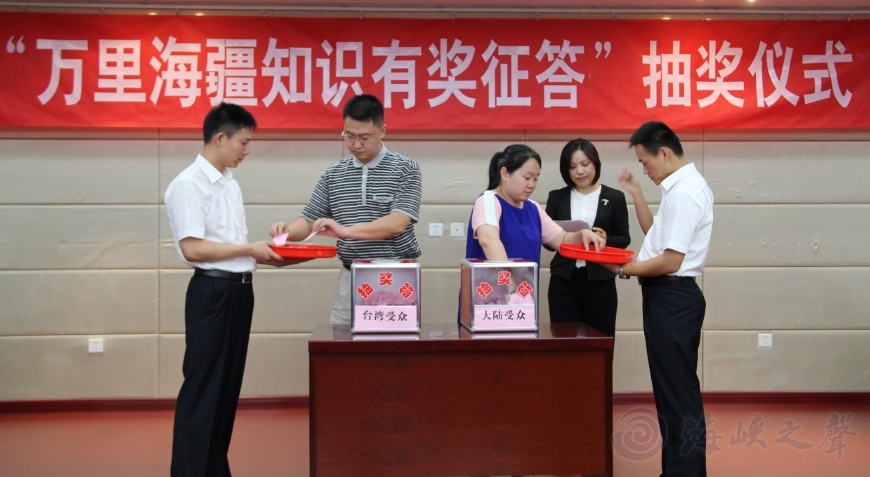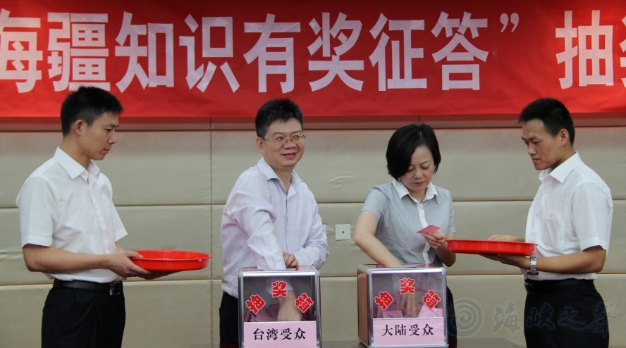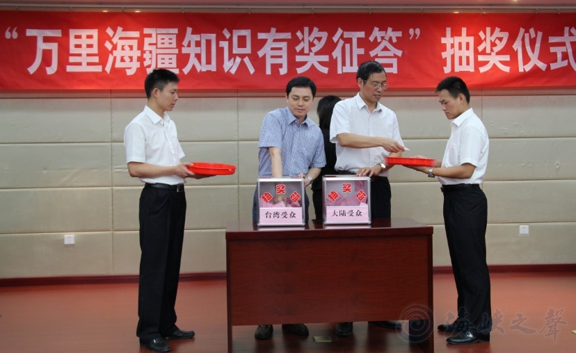 為進(jìn)一步擴(kuò)大《萬(wàn)里海疆巡禮》活動(dòng)效果,強(qiáng)化海洋強(qiáng)國(guó)觀念及兩岸受眾對(duì)海洋國(guó)土的了解,海峽之聲廣播電臺(tái)、福建省海洋與漁業(yè)廳聯(lián)合承辦“萬(wàn)里海疆知識(shí)競(jìng)答”活動(dòng),獲得兩岸民眾的熱情響應(yīng),經(jīng)過(guò)近兩個(gè)月的答案征集,至10月10日截止日,有8779位兩岸民眾(其中臺(tái)灣民眾4083人)踴躍參與本次活動(dòng)。本著公平、公正、公開(kāi)原則,在現(xiàn)場(chǎng)公證人員、各協(xié)辦單位人員和社會(huì)各界代表的監(jiān)督之下,本次征答活動(dòng)抽獎(jiǎng)儀式于10月19日15時(shí)30分在福州舉行,來(lái)自兩岸一百三十名參與者分別獲得一、二、三等獎(jiǎng)和鼓勵(lì)獎(jiǎng)。(詳細(xì)名單附后)
