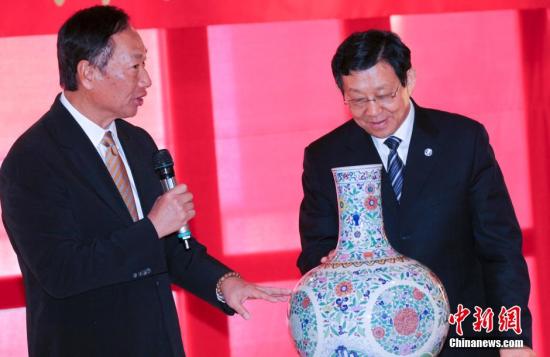 郭臺銘代表鴻海,向陳德銘致贈一個斗彩唐草團花天球瓶,寓意兩岸和平、經(jīng)合順利。另贈送專門為母親訂作的鳳梨酥,郭臺銘笑言“絕對保證食品安全”,引來一陣掌聲。