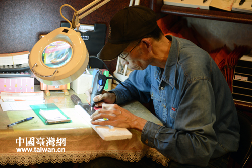 吳師傅在剛制好的鋼刀上刻出“萬里海疆巡禮·金門”字樣。(李建偉 攝)