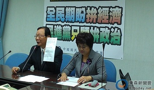 國民黨團(tuán)召開記者會,質(zhì)疑民進(jìn)黨想讓服貿(mào)協(xié)議在本會期消失。(臺媒圖)