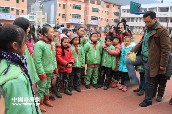冷水鎮(zhèn)小學(xué)經(jīng)過三年教育實驗,學(xué)校環(huán)境翻天覆地。圖為頂新公益基金會志愿者與學(xué)生們在運動場做游戲(中國臺灣網(wǎng) 李徽 攝)