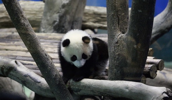 當(dāng)天傍晚6點(diǎn),工作人員將出生182天的“圓仔”從房間中抱出,放在由玻璃隔開(kāi)的展館中供媒體拍攝。與“圓仔”一同出現(xiàn)的還有媽媽“圓圓”。母女倆一起玩耍了一會(huì)兒后就分開(kāi)活動(dòng)!皥A仔”步伐穩(wěn)健、能走能爬、活動(dòng)自如,一會(huì)就爬上由樹(shù)干搭成的木頭架子,在搖頭晃腦之余還不時(shí)舔舔樹(shù)干,有時(shí)還趴在樹(shù)干上休息。