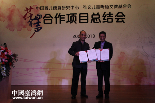中國(guó)聾兒康復(fù)研究中心主任胡向陽(yáng)和明門(mén)集團(tuán)董事長(zhǎng)、雅文兒童聽(tīng)語(yǔ)文教基金會(huì)主席鄭欽明交換了下一個(gè)五年《中文聽(tīng)覺(jué)口語(yǔ)師資培訓(xùn)項(xiàng)目合作協(xié)議》。(中國(guó)臺(tái)灣網(wǎng) 王怡然 攝)