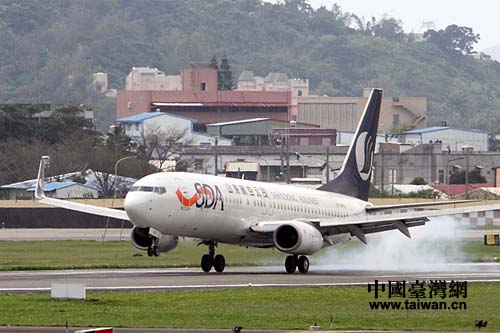 山航濟(jì)南-花蓮直航班機(jī)在臺(tái)灣花蓮機(jī)場(chǎng)降落。(圖片來源:山東省臺(tái)辦)