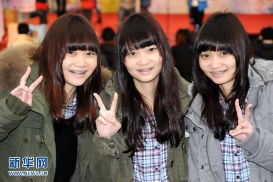 2月15日,三胞胎姊妹李依潺、李依潔、李依潤(從左至右)出席活動(dòng)。當(dāng)日,臺(tái)北市舉辦第二屆“雙胞胎幸?倓(dòng)員”活動(dòng),415對雙胞胎和三胞胎家庭齊聚一堂,分享成長經(jīng)驗(yàn)。 新華社發(fā)(吳景騰 攝)