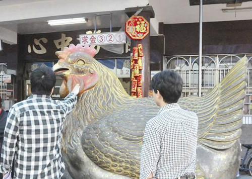 說紫南宮“俗”,是因為這是民眾“求財”的好去處。母雞算是紫南宮的吉祥物了,因為雞能生蛋、蛋能生雞……循環(huán)不止,這會生財。在離宮廟三四十米的地方,便有一個雞孔,上面是只母雞雕塑,下面有個圓洞,據(jù)說從圓洞鉆過的人,財氣會比較旺。在廟門的一側(cè),還有一只碩大的母雞雕塑。廟方負(fù)責(zé)人介紹,摸了這只母雞會讓你發(fā)財。說起這尊雕像,還跟福建有淵源,十多年前,廟方在泉州發(fā)現(xiàn)一塊石頭,非常適合雕母雞,便將其買來跨海運到臺灣,做成了這只人見人愛的“金雞母”。