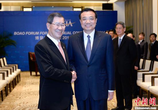 中共中央政治局常委、國務(wù)院總理李克強(qiáng)10日下午在海南省博鰲會(huì)見了前來出席博鰲亞洲論壇2014年年會(huì)的臺(tái)灣兩岸共同市場基金會(huì)榮譽(yù)董事長蕭萬長一行。(來源:中新網(wǎng) 劉震 攝)