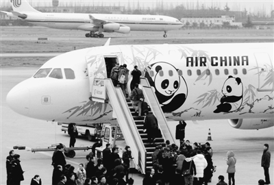 2009年1月,國航西南分公司熊貓彩繪春運(yùn)包機(jī)從成都首航臺北。
