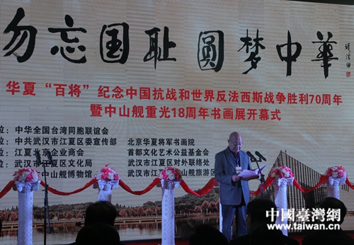 中國臺(tái)灣網(wǎng)3月26日武漢訊 勿忘國恥,圓夢(mèng)中華。今天,華夏百將紀(jì)念中國抗戰(zhàn)和世界反法西斯戰(zhàn)爭勝利70周年暨中山艦重光18周年書畫展,在中山艦博物館開幕。
