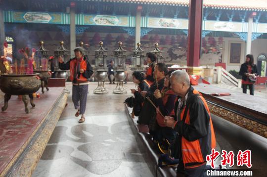 69歲的信眾許伯在廟中替孫子求了一支簽,“希望我孫子今年身體健康,一家人都平平安安就最好了!痹S伯笑著說,他11歲的孫子是團(tuán)內(nèi)年齡最小的成員。
