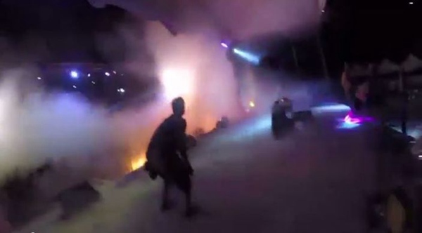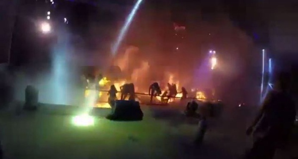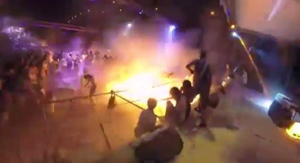 最新曝光的片段在舞臺(tái)上拍攝,舞臺(tái)工作人員當(dāng)時(shí)用二氧化碳高壓氣體,將堆放在舞臺(tái)前方的彩粉噴向臺(tái)下觀眾,彩色粉末在舞臺(tái)前方飛散,大批民眾還沉浸在搖滾樂中,但當(dāng)工作人員在噴第3次時(shí),舞臺(tái)右上方突然冒出紅色火光,火勢向右前方觀眾燃燒。