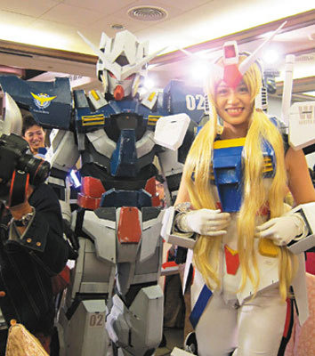婚宴進行到一半時,燈光突然暗下,投影屏幕出現(xiàn)“黑武士”的臉孔,新郎變身2米高的“鋼彈”出場,和“黑武士”用光劍PK,在體力漸漸耗盡時,新娘化身“鋼彈娘”到場支援,終于將黑武士擊退,上演一出夫妻“并肩作戰(zhàn)”的好戲。