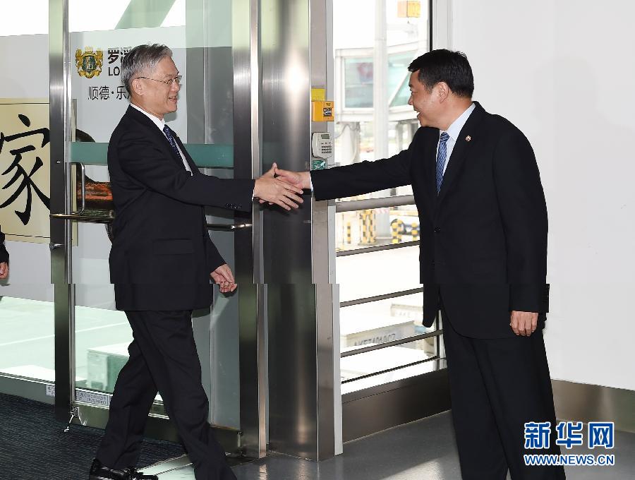 10月13日,臺灣方面陸委會主委夏立言(左)率團抵達廣州白云機場,國臺辦副主任陳元豐在機場迎接。 10月13日,臺灣方面陸委會主委夏立言率團抵達廣州白云機場,國臺辦副主任陳元豐前往機場迎接。14日上午,國臺辦主任張志軍將與夏立言在廣州舉行兩岸事務主管部門負責人工作會面。新華社記者陳曄華攝