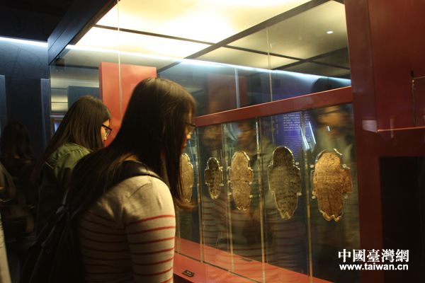 兩岸青年觀看殷墟文化遺址內(nèi)的甲骨文片。(中國(guó)臺(tái)灣網(wǎng) 梁行 攝)