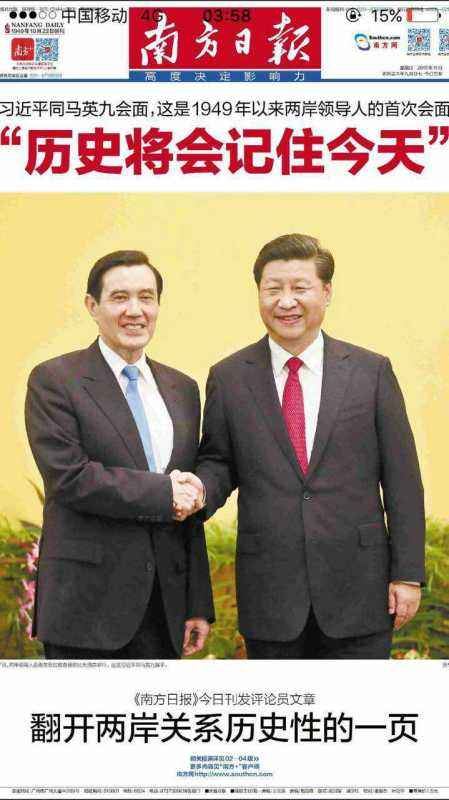 南方日?qǐng)?bào)、羊城晚報(bào)昨天不約而同地在頭版以近整版篇幅刊發(fā)習(xí)近平同馬英九握手的大幅照片。南方日?qǐng)?bào)頭版整版刊登的“習(xí)馬握手”照片,并在照片上方配以特大號(hào)紅色通欄標(biāo)題《“歷史將會(huì)記住今天”》,格外醒目。整個(gè)版面大氣磅礴,極富視覺沖擊力,令人過(guò)目難忘。南方日?qǐng)?bào)的二版、三版、四版均冠以“聚焦習(xí)馬會(huì)”的紅色報(bào)頭,濃墨重彩對(duì)“習(xí)馬會(huì)”進(jìn)行詳細(xì)解讀。其中二版刊登了新華社消息《習(xí)近平同馬英九會(huì)面》并配以“習(xí)馬會(huì)談”的大幅通欄照片;三版以南方日?qǐng)?bào)評(píng)論員文章《翻開兩岸關(guān)系歷史性的一頁(yè)》統(tǒng)領(lǐng)整版,同時(shí)刊登了南方日?qǐng)?bào)報(bào)特派記者的現(xiàn)場(chǎng)特寫及對(duì)郁慕明的專訪等,3篇南方日?qǐng)?bào)特派記者的報(bào)道從不同角度反映“習(xí)馬會(huì)”的重大意義及突破;四版則立足廣東,采訪臺(tái)胞和相關(guān)部門,共刊發(fā)了《兩岸和平是人民最大福祉》等6篇自采報(bào)道,從粵臺(tái)關(guān)系上著手,突出廣東在“兩岸關(guān)系”中的重要地位。