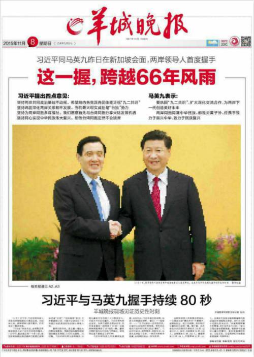昨天的羊城晚報(bào)以A1、A2、A3、A4四個(gè)版,突出“習(xí)馬會(huì)”的現(xiàn)場(chǎng)報(bào)道、背景分析和各界反響,其自主策劃的報(bào)道成為一大亮點(diǎn)。該報(bào)特派新加坡記者的一組稿件,重點(diǎn)捕捉現(xiàn)場(chǎng)細(xì)節(jié),并且及時(shí)推出當(dāng)?shù)胤错憽丢{城僑胞熱議“習(xí)馬會(huì)”》。其中頭版《這一握,跨越66年風(fēng)雨》,通欄大幅套紅標(biāo)題,通欄握手圖片,奪人眼球。下半版《習(xí)近平與馬英九握手持續(xù)80秒》,由羊城晚報(bào)特派新加坡記者采寫,現(xiàn)場(chǎng)感濃郁。