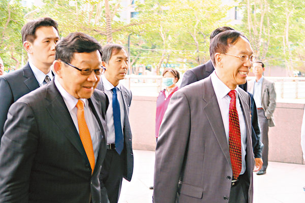 海協(xié)會會長陳德銘(前左)2日上午參訪陸資企業(yè)京泰發(fā)展有限公司。臺灣“中央社”