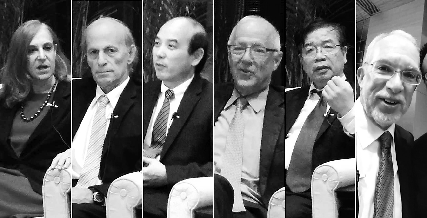 自左至右:美國國際戰(zhàn)略研究中心高級(jí)顧問葛來儀、布魯金斯學(xué)會(huì)高級(jí) 研究員杰弗里·貝德、中國現(xiàn)代國際關(guān)系研究院副院長袁鵬、美中關(guān)系全國 委員會(huì)會(huì)長斯蒂芬·歐倫斯、上海社會(huì)科學(xué)院副院長黃仁偉、布魯金斯學(xué)會(huì) 高級(jí)研究員埃文斯·李維亞。
