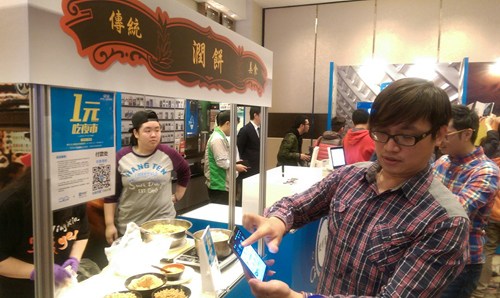 圖為工作人員現(xiàn)場演示如何在臺北夜市中使用支付寶結帳。