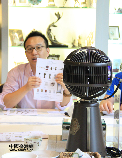 在2016天津臺灣名品博覽會即將舉行之際,“尋跡臺灣名品”媒體采訪團于6月14日至19日走進臺灣,探訪臺灣名品企業(yè)。圖為美砌國際企業(yè)有限公司負責人許家祥介紹該公司新設計的桌上型電風扇。