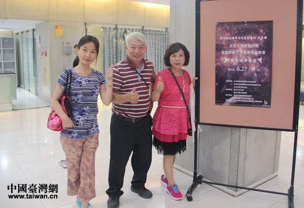 臺(tái)北觀眾陳先生、鐘女士(右)與楊小姐(左)散場(chǎng)后在演出海報(bào)前拍照留影,要把照片發(fā)上臉譜網(wǎng)(facebook),將北京學(xué)子送來(lái)的精彩和感動(dòng)傳遞給更多臺(tái)灣民眾。(中國(guó)臺(tái)灣網(wǎng) 王思羽 攝)