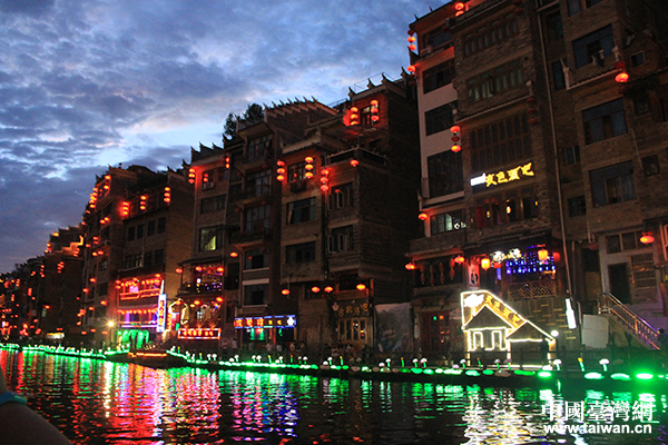 此時(shí)的舞陽(yáng)河,岸上燈光搖曳,水面波光粼粼,輕風(fēng)徐徐吹來,岸上的吊腳樓上傳來斷斷續(xù)續(xù)的樂聲與歡笑,游船壓碎兩岸倒映在水面的五彩燈火前行,別有一番情韻。