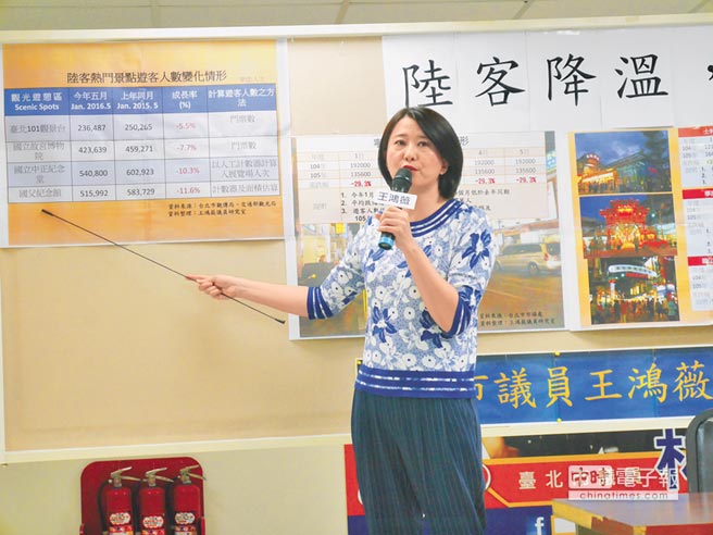 臺(tái)北市議員王鴻薇指出陸客降溫,許多觀光景點(diǎn)游客數(shù)和旅館住房率銳減。(圖片來源:臺(tái)灣“中時(shí)電子報(bào)”)