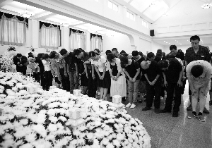 上午9時(shí),殯儀館告別廳內(nèi),哀樂低沉,“7·19事故”遇難者公祭儀式正式開始。23名遇難者的遺像依次排列在靈堂前鮮花叢中。遺像上方的橫幅上寫著:“沉痛悼念‘7·19事故’遇難市民”。