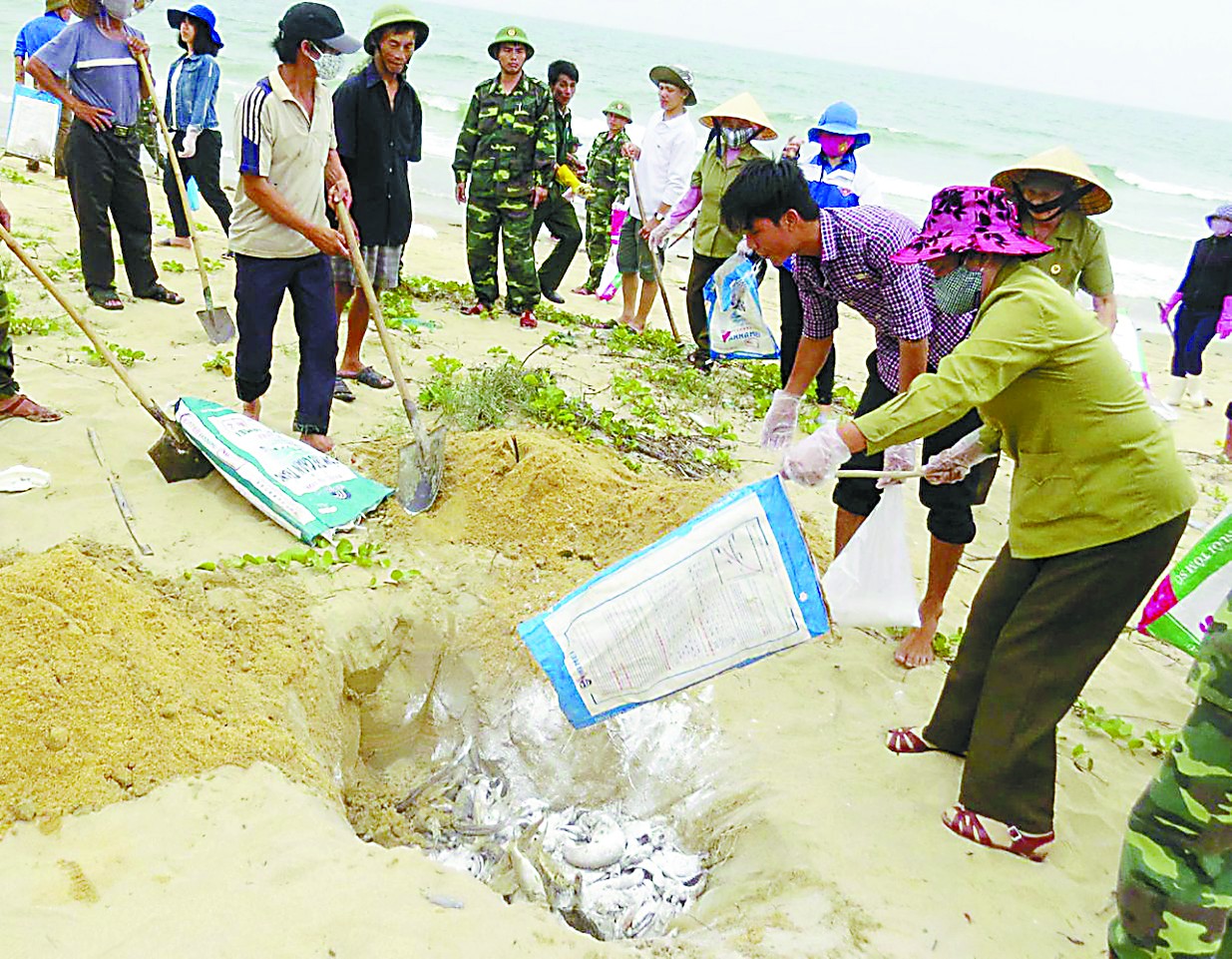4月,越南漁民在海灘上掩埋死魚。臺(tái)塑集團(tuán)在當(dāng)?shù)赝顿Y的河靜大煉鋼廠被指制造了污染。