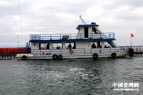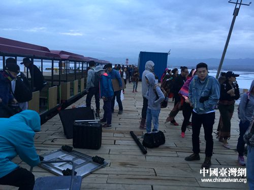 記者們登上開往鹽湖的船,去拍湖中“天空之鏡”的美景。(中國臺灣網(wǎng) 蕪?fù)?攝)