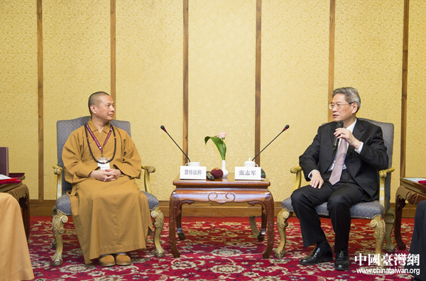 張志軍會(huì)見(jiàn)由慧傳法師率領(lǐng)的中華人間佛教聯(lián)合總會(huì)參訪團(tuán)一行。(中國(guó)臺(tái)灣網(wǎng) 圖)