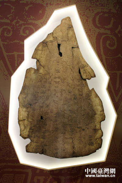 圖為放大的甲骨文片。(中國臺灣網(wǎng) 張玲 攝)