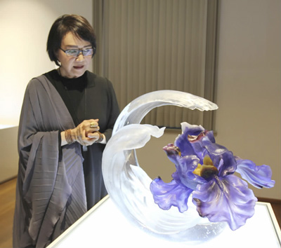 《一朵中國琉璃花——當(dāng)代琉璃藝術(shù)展》日前在比利時布魯塞爾中國文化中心揭幕。中國臺灣琉璃藝術(shù)家楊惠姍和張毅的12件中大型琉璃藝術(shù)作品與比利時觀眾面對面。本次展覽呈現(xiàn)了楊惠姍“一朵中國琉璃花”、“澄明之悟”以及張毅“焰火禪心”等系列作品。圖為楊惠姍在琉璃花前。(本報記者 許立群攝)