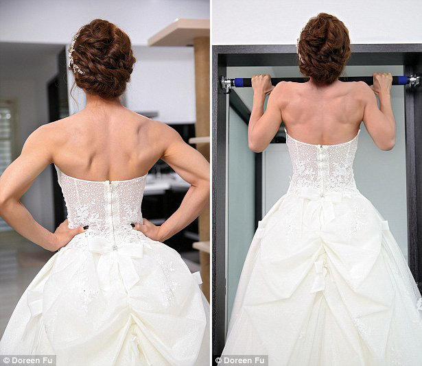 據(jù)英國《每日郵報》11月1日報道,對于大部分新娘來說,婚禮上最難忘的時刻就是走在紅毯上的幸福瞬間了,然而對于臺灣的一位新娘來說,在婚禮上穿著婚紗做引體向上才是她心目中的夢想時刻。(編譯/余詩泉)