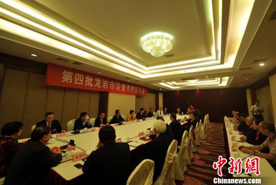 在授榮儀式上,龍巖市委書記李德金、代市長林國耀向第四批榮譽市民頒發(fā)了獎杯、證書。