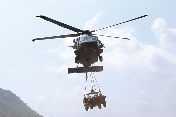 在今年8月臺(tái)灣“漢光軍演”中,一架美制“黑鷹”直升機(jī)吊起一輛吉普車。