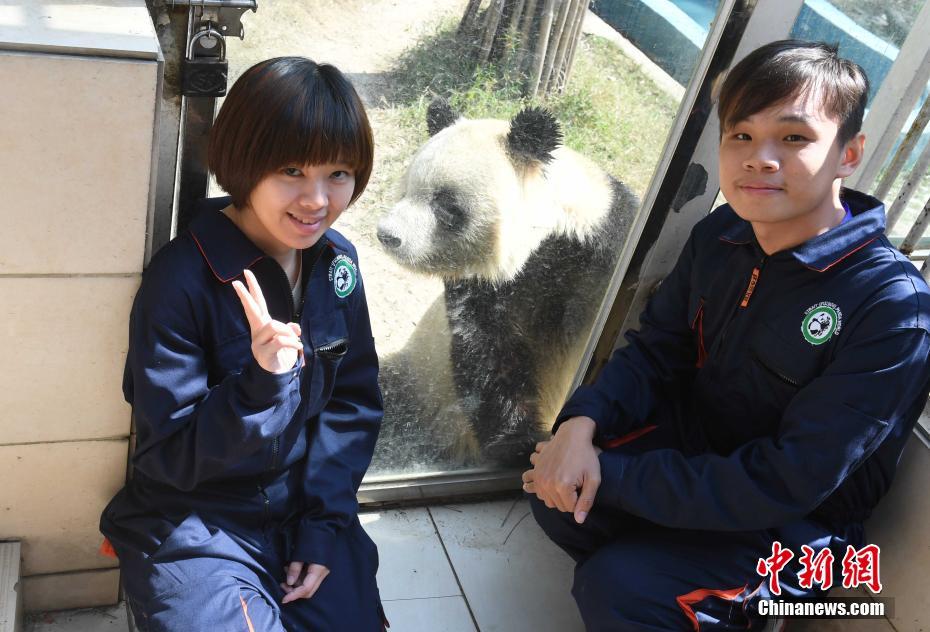 2月16日,來自臺灣大學(xué)、臺灣嘉義大學(xué)的8名臺灣大學(xué)生在2名老師的帶領(lǐng)下在海峽(福州)熊貓世界參訪交流并體驗(yàn)飼養(yǎng)員工作。圖為臺灣大學(xué)大二學(xué)生鄭志明(右)、臺灣嘉義大學(xué)大四學(xué)生王俞琇(左)與4號大熊貓合影留念。 劉可耕 攝