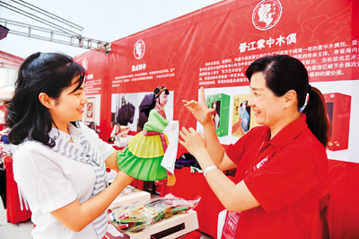 圖為游客(左)在福建晉江五店市傳統(tǒng)街區(qū)體驗(yàn)掌中木偶。新華社記者 宋為偉攝