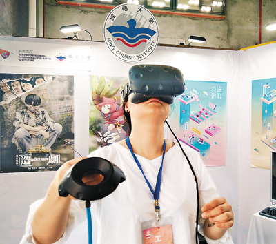 圖為活動(dòng)中一名女同學(xué)頭戴學(xué)生自制的VR設(shè)備體驗(yàn)虛擬現(xiàn)實(shí)場(chǎng)景。 徐 林?jǐn)z
