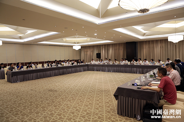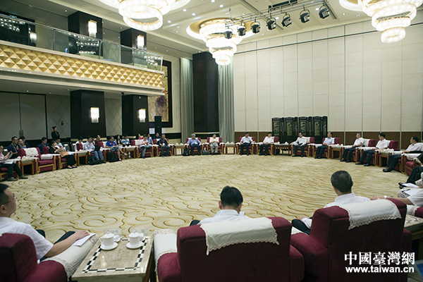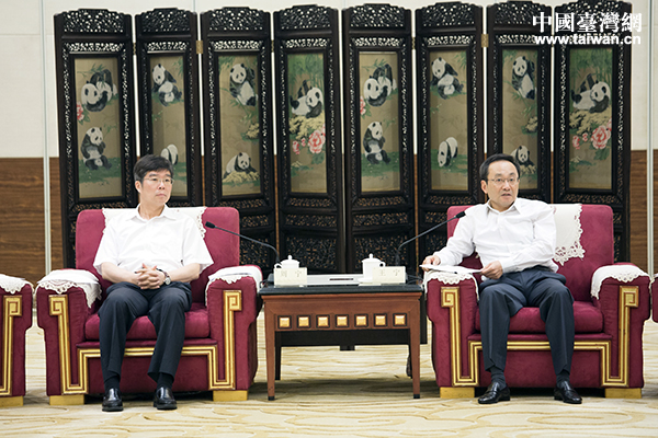 四川省常務(wù)副省長王寧(右)會(huì)見“海峽兩岸記者四川行”聯(lián)合采訪團(tuán)一行,國務(wù)院臺(tái)辦主任助理周寧(左)參加會(huì)見。(中國臺(tái)灣網(wǎng) 于斯文 攝)