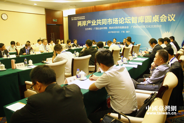 中國臺灣網(wǎng)9月15日廣西南寧訊。ㄓ浾 王怡然)9月15日下午,第十三屆桂臺經(jīng)貿(mào)文化合作論壇分論壇——兩岸產(chǎn)業(yè)共同市場論壇智庫圓桌會議在廣西南寧舉行,來自中國社科院臺灣研究所、廣西社會科學(xué)院、南開大學(xué)、臺灣兩岸共同市場基金會、臺灣中華經(jīng)濟研究院等研究機構(gòu)和高校的50余名兩岸專家學(xué)者,就“加強民間交流,促進兩岸社會融合發(fā)展”等議題展開研討。