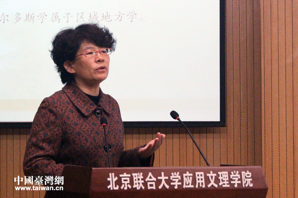 北京聯(lián)合大學應用文理學院院長兼北京學研究基地主任張寶秀圍繞“北京學研究新進展”進行主旨演講。(中國臺灣網(wǎng) 張潔 攝)