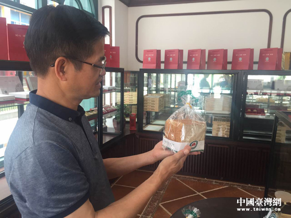 老臺商王江明1997年從臺灣淡水來到大陸,退休后在廈門開了一家面包體驗店。圖為王江明向記者介紹面包產(chǎn)品。
